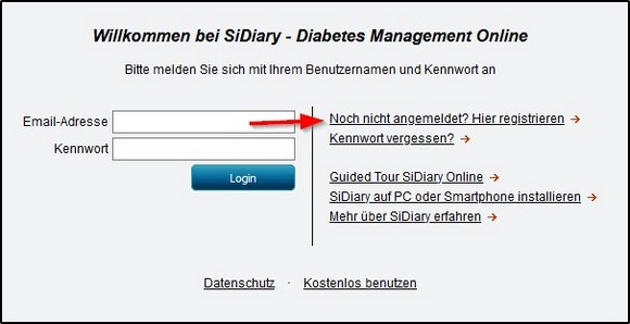 Falls Sie noch kein Konto bei SiDiary-Online haben sollten Sie das jetzt einrichten. Falls Sie die Seite in englisch sehen können Sie sie mit einem Klick auf die Deutsche Flagge rechts oben auf deutsch umschalten. Klicken Sie dann auf den Link 'Noch nicht angemeldet? Hier registrieren'.