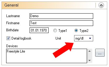 Of course SiDiary is supporting your daily work by providing these two major blood glucose units! You can select it in the menu 'Diabetesprofile ->Therapy details and goals ->General':