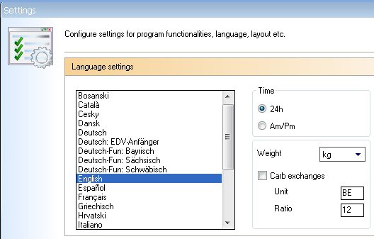 SiDiary displays a language selection screen on the very first start. If you've selected the wrong language by mistake and close this screen, you will then get all screens in the selected language! This could make it hard to find the right button for changing the language, if you don't know where it is located.