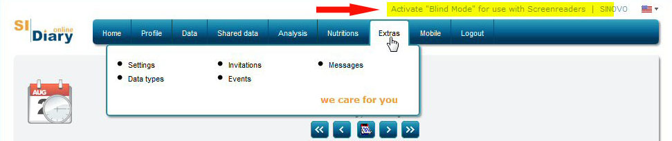 If you are using a screen reader (or an Android tablet), it may happen that the sub-menus at SiDiary Online are difficult to be used. (In a normal web browser they show up when you move the mouse arrow over the main menu items, see picture below)