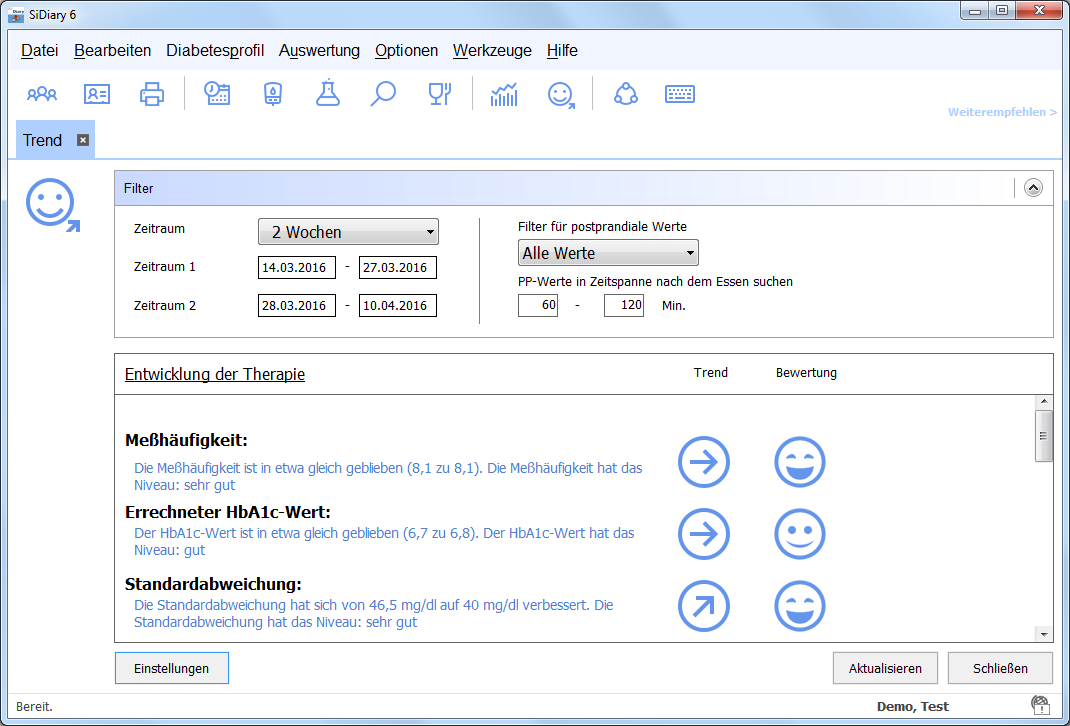 SiDiary denkt auch an Motivationshilfen für den Alltag. Das war jedenfalls die Hauptintention für die Anzeige der Trends in Form von Smileys (Emoticons). Anhand frei wählbarer Grenzen können die Eltern mit dem Arzt festlegen, welche Bereiche für das Kind sehr gut, gut und weniger gut sind. Ein entsprechender Smiley zeigt diesen Trend dann an.