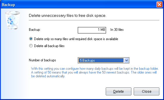 You can see here how much space your backup files need right now. Now you can select how the backup files should be deleted. Either Only so many files until required disc space is available (interesting for users of the SiDiary USB-Stick) or Delete all backup files.