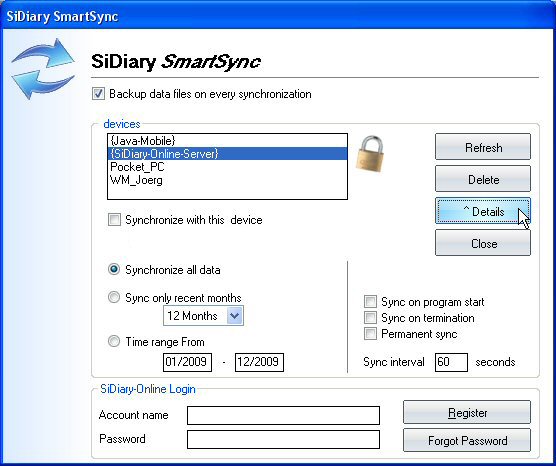 This screen shows the mobile devices, that you have already synchronized with SiDiary or which were found at this time. In our example above the “device” {SiDiary-Online-Server} is selected (and marked with a blue bar).
